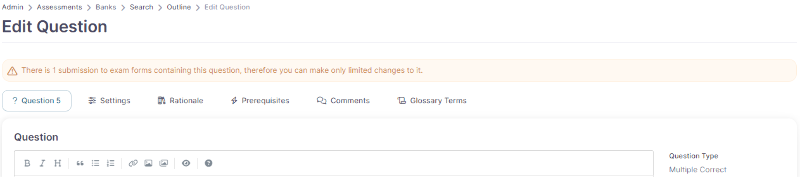 Depending on the Organization setting, Administrators are able to edit existing Assessment questions. When editing questions that have already been published to a Form, a warning message will appear at the top of the page.
