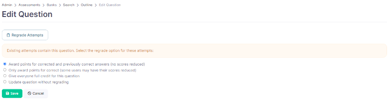 Depending on the change that was made to the question, an Admin can choose if they want to regrade the question or update the question without regrading.