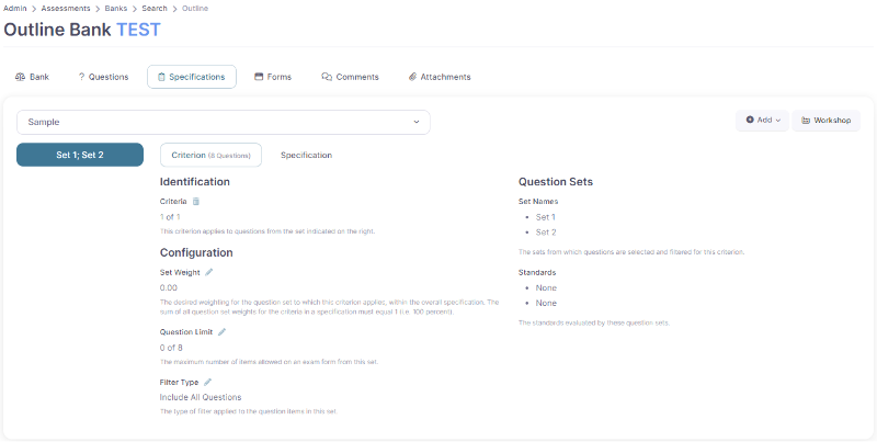 Every Bank will contain at least ONE Specification. Specifications provide the rules that determinewhich questions will be contained on an exam Form. The same Specification may be used for multiple Forms, or there may be a different specification for each Form.