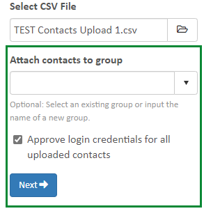 Optional: the contacts you are uploading can all be attached to a specific group if desired. Select an existing group or input the name of a new group.
