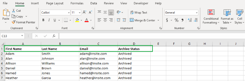 Create a CSV UTF-8 (comma delimited) (*.csv) file containing all the contacts you want to archive. The file should contain the following columns:
