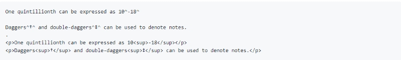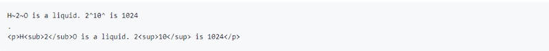 Superscripts can be written by surrounding a text by ^ characters; subscripts can be written by surrounding the subscripted text by ~ characters